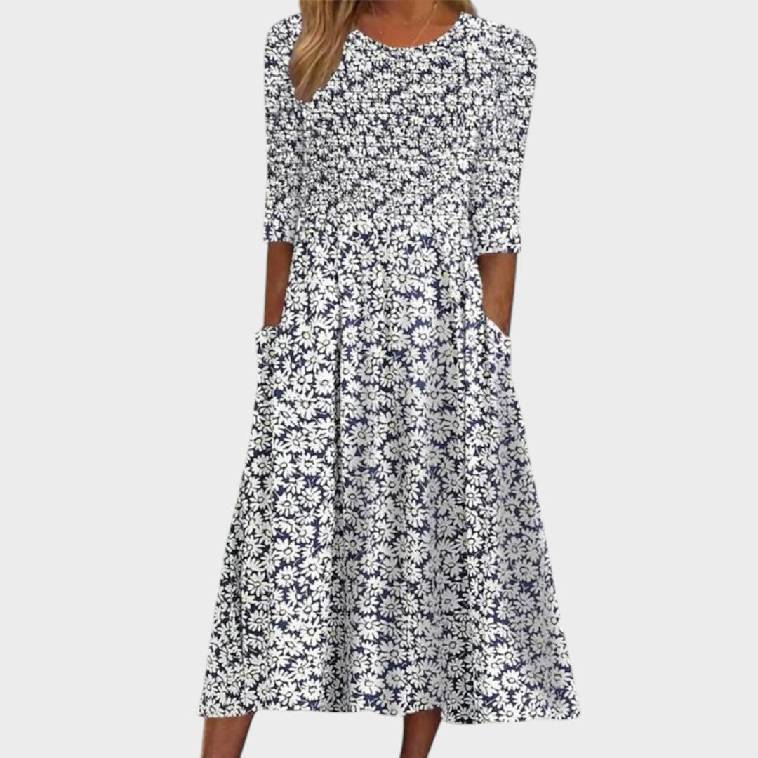 This beautiful blue-white midi dress with its delicate floral pattern is the perfect combination of comfort and style. Thanks to its airy material and feminine cut, it provides freedom of movement and is easy to wear all day long. Side pockets add practicality, while the elegant pattern highlights freshness and sophistication in any situation.