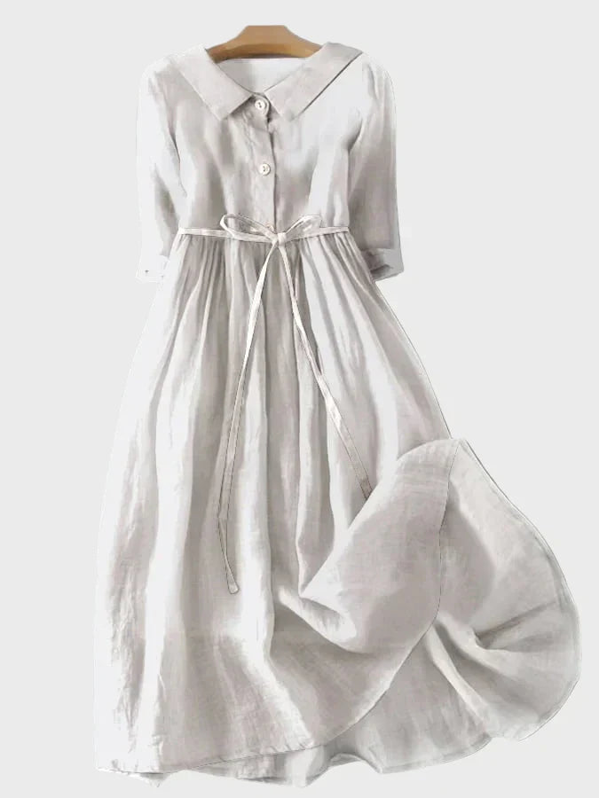 Ta delikatna niebieska sukienka emanuje spokojem i elegancją, idealna na każdą okazję. Jej prosty fason zapewnia komfort i ponadczasowy styl, a pasek w talii subtelnie podkreśla kobiecą sylwetkę, pozwalając tkaninie naturalnie się układać.