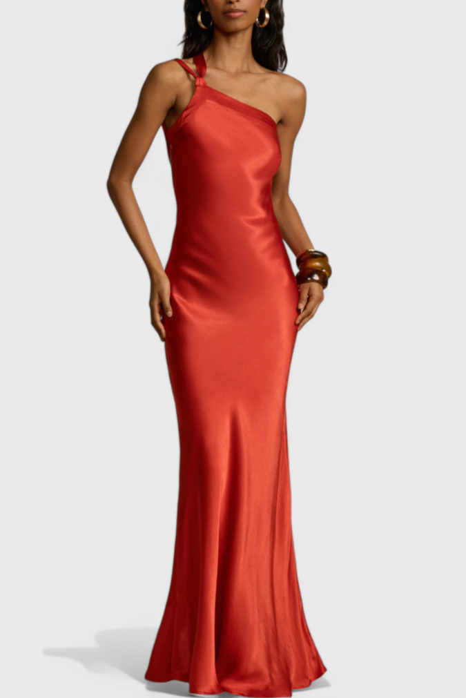 Nowoczesny blask w sylwetce, która pozostawia ślad. Suknia Sofia zachwyca eleganckim, sięgającym do ziemi krojem oraz asymetrycznym fasonem z odkrytymi plecami, emanującym wyrafinowaniem. Jej błyszcząca, wysokogatunkowa tkanina porusza się płynnie i odbija światło przy każdym kroku – idealny wybór na wieczory, kiedy chcesz wyróżnić się elegancją.