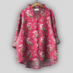 Romantyczna lniana bluzka w intensywnym różowym odcieniu z kwiatowym wzorem róż, która emanuje kobiecością i elegancją. Dekolt w kształcie litery V z subtelnymi falbanami oraz luźny krój zapewniają komfort oraz lekkie, przewiewne uczucie, podczas gdy asymetryczny dół z wydłużonym tyłem dodaje nowoczesnego charakteru każdej stylizacji.