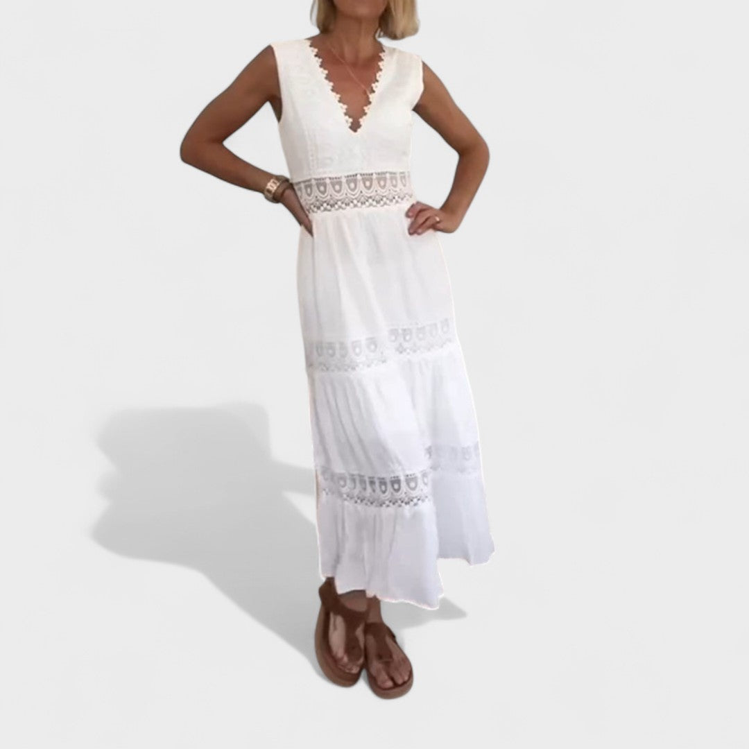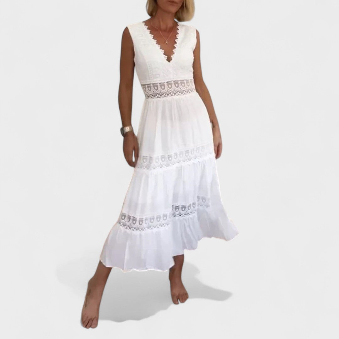 Sukienka, która łączy w sobie delikatność i wyrafinowanie – idealna na wyjątkowe okazje lub do codziennych stylizacji, szczególnie jeśli zależy Ci na swobodnym, a zarazem szykownym wyglądzie. Płynny fason, dekolt w kształcie litery V oraz koronkowe detale podkreślające kobiecość zapewniają komfort i urok przy każdym ruchu. Uniwersalny element garderoby, który świetnie sprawdzi się zarówno podczas nieformalnych spotkań, jak i uroczystości.