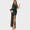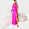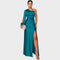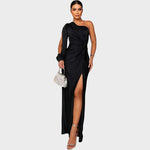 Ta suknia wieczorowa emanuje wyrafinowaniem i nowoczesnym designem. Asymetryczny krój z jednym rękawem oraz efektowna, marszczona talia podkreślają kobiecą sylwetkę, a głębokie rozcięcie dodaje zmysłowości i elegancji. Idealna na uroczyste okazje, gale lub specjalne wydarzenia, podczas których chcesz zabłysnąć i pozostawić niezapomniane wrażenie.