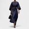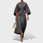 Wyrafinowana długa sukienka z dekoltem łódką i bufiastymi rękawami tworzy szykowną, architektoniczną sylwetkę. Szeroki pasek podkreśla talię, podczas gdy efektownie opadający dół zapewnia swobodę ruchów i wdzięczny chód. Minimalistyczne detale i czyste linie sprawiają, że to idealny wybór na uroczyste okazje, wydarzenia biznesowe i wieczorne wyjścia.