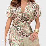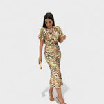 Szykowna sukienka midi z zwiewnymi rękawami i drapowanym dekoltem w kształcie litery V, który subtelnie podkreśla linię dekoltu. Tkanina o wyrafinowanym połysku i dekoracyjnym motywie elegancko układa się na sylwetce, a podkreślona talia modeluje kobiecą linię. Dół lekko się rozszerza, co pozwala na swobodne, grację kroki — idealna propozycja na wesela, koktajle i wszelkie wyjątkowe okazje.