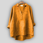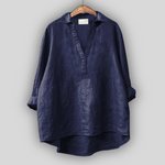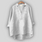 Elegancka lniana bluzka w kolorze białym, która emanuje świeżością i ponadczasowym stylem. Posiada dekolt w serek z dyskretnym zapięciem, długie rękawy z możliwością podwinięcia oraz asymetryczny dół z dłuższym tyłem, co zapewnia komfort i swobodę ruchu. Idealny wybór do stylowych letnich stylizacji lub eleganckiego, codziennego wyglądu.