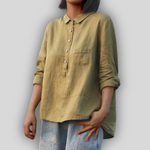 Klasyczna lniana bluzka, która emanuje dyskretną elegancją i codziennym komfortem. Posiada klasyczny kołnierzyk z zapięciem na guziki z przodu oraz praktyczną kieszeń na piersi. Luźny krój i długie rękawy z możliwością podwinięcia sprawiają, że jest idealna na każdą porę dnia.