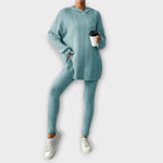 Ten zestaw z dzianiny prążkowanej to idealny wybór dla tych, którzy szukają praktyczności z nutą elegancji. Personalizowany krój oraz wydłużona bluzka tworzą nowoczesny wygląd, doskonały do noszenia w domu, w pracy lub podczas nieformalnych wyjść.