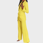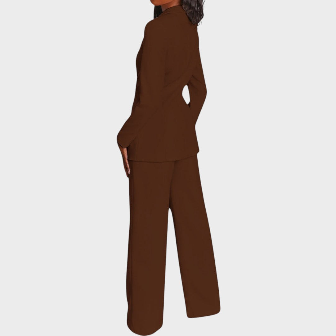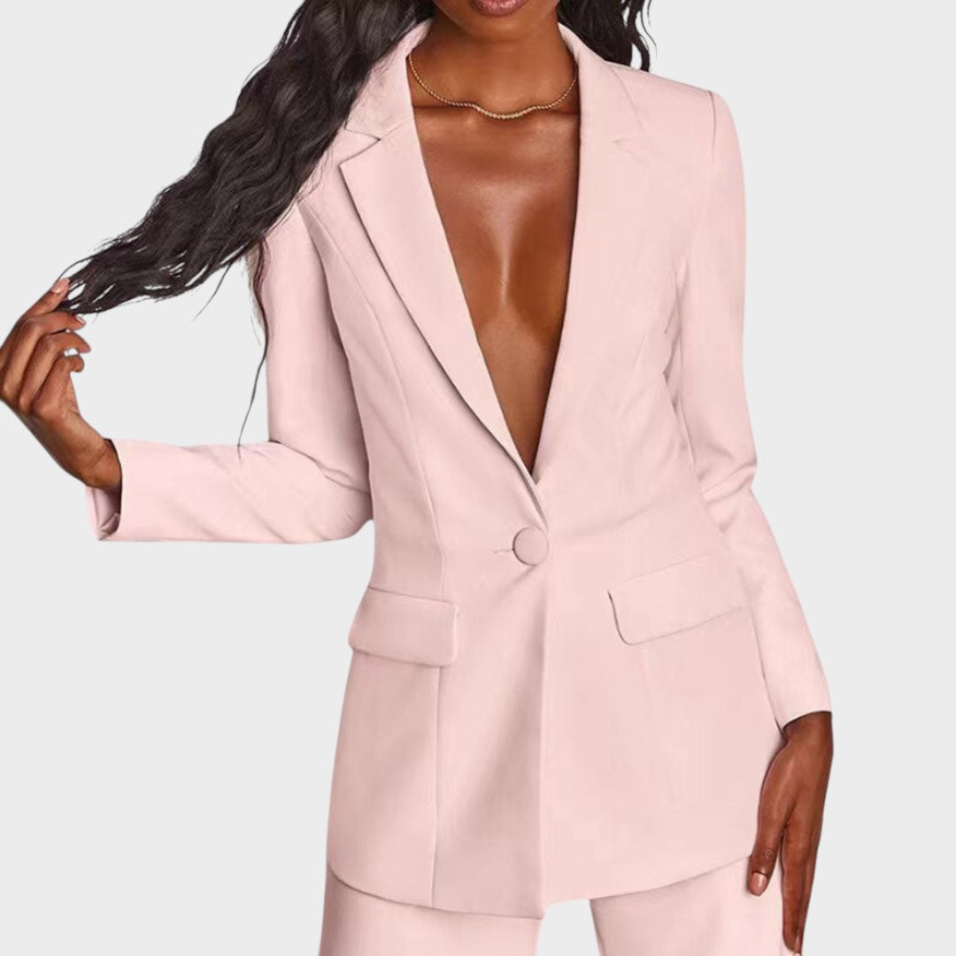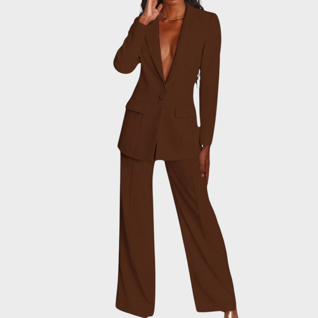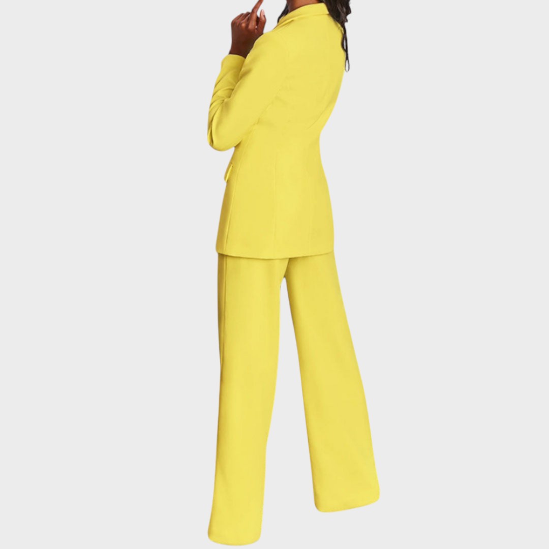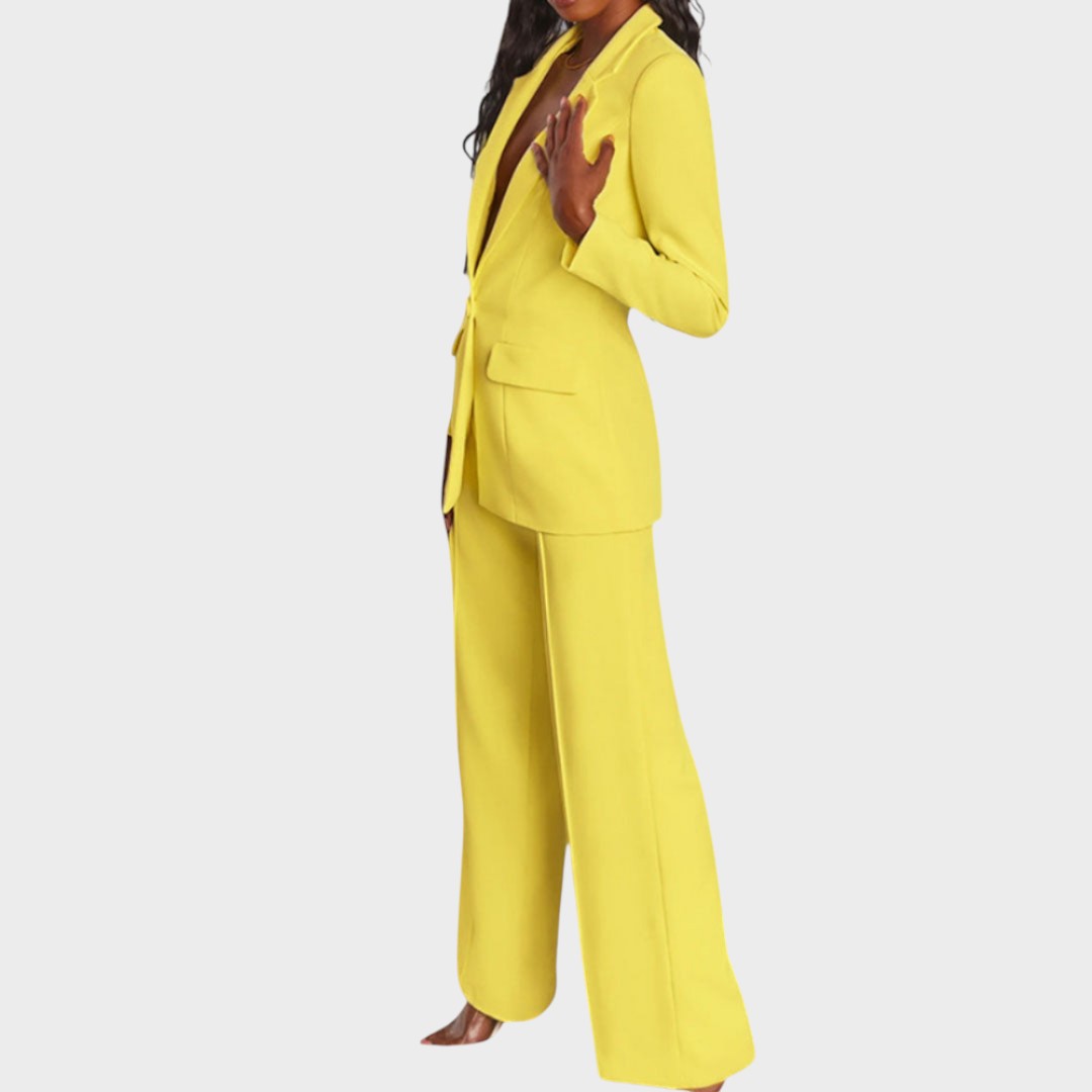 Damski garnitur, który łączy w sobie wyrafinowanie i nowoczesny styl. Długa marynarka z ostrymi klapami, zapięciem na jeden guzik oraz kieszeniami z patkami pięknie podkreśla talię i optycznie wydłuża sylwetkę. Spodnie są proste, z lekko szerokimi nogawkami i gładką linią, co zapewnia czysty, wydłużony profil oraz swobodę ruchów. Tkanina o pięknym drapowaniu gwarantuje komfort od porannego spotkania aż po wieczorne wyjście. Można nosić jako komplet lub osobno – równie efektownie w biurze, na wydarzeniu czy podczas oficjalnej kolacji.