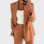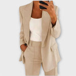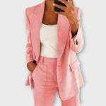 Damski komplet odzieżowy Christina™ wykonany jest z wysokiej jakości materiałów i oferuje idealne połączenie wygody oraz wyrafinowanego stylu. Klasyczny krój z marynarką i spodniami zapewnia elegancki wygląd, który z łatwością dopasuje się zarówno do biznesowych, oficjalnych, jak i codziennych okazji.