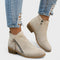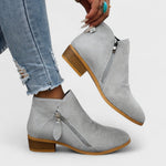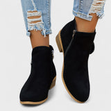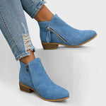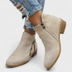 Damskie botki do kostki z bocznym zamkiem, który umożliwia szybkie zakładanie, oraz z elegancko zaokrąglonym przodem w kształcie migdała. Miękki efekt zamszu na cholewce, stabilny niski obcas i amortyzowana wkładka zapewniają komfort od rana do wieczora. Antypoślizgowa podeszwa i precyzyjne szwy gwarantują doskonały, nowoczesny wygląd – idealne do dżinsów, sukienek oraz stylizacji do biura.