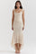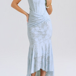 Imponująca sukienka z indywidualnym wycięciem i wypukłym wzorem, który elegancko otula ciało. Modelowany gorset zapewnia wsparcie i kobiecy wygląd, a starannie zaprojektowane plisowania w talii podkreślają sylwetkę. Asymetryczna spódnica dodaje ruchu i luksusu każdej stylizacji.
