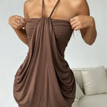 Mini sukienka w odcieniu czekoladowym, która emanuje elegancją i kobiecością. Posiada wiązanie na szyi, efektowny, drapowany detal z przodu oraz dopasowany fason, który podkreśla sylwetkę. Idealna na wieczorne wyjścia i specjalne okazje.