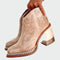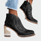 Nowoczesne damskie botki w stylu western z unikalnymi, haftowanymi wzorami oraz dekoracyjnymi detalami na podeszwie. Drewniany obcas z przezroczystym elementem nadaje im wyjątkowy charakter i elegancję, a wygodny fason sprawia, że buty są idealne do stylowych stylizacji od rana do wieczora. Wyrazisty model łączący komfort i dynamiczny wygląd.