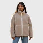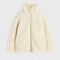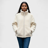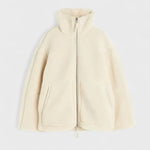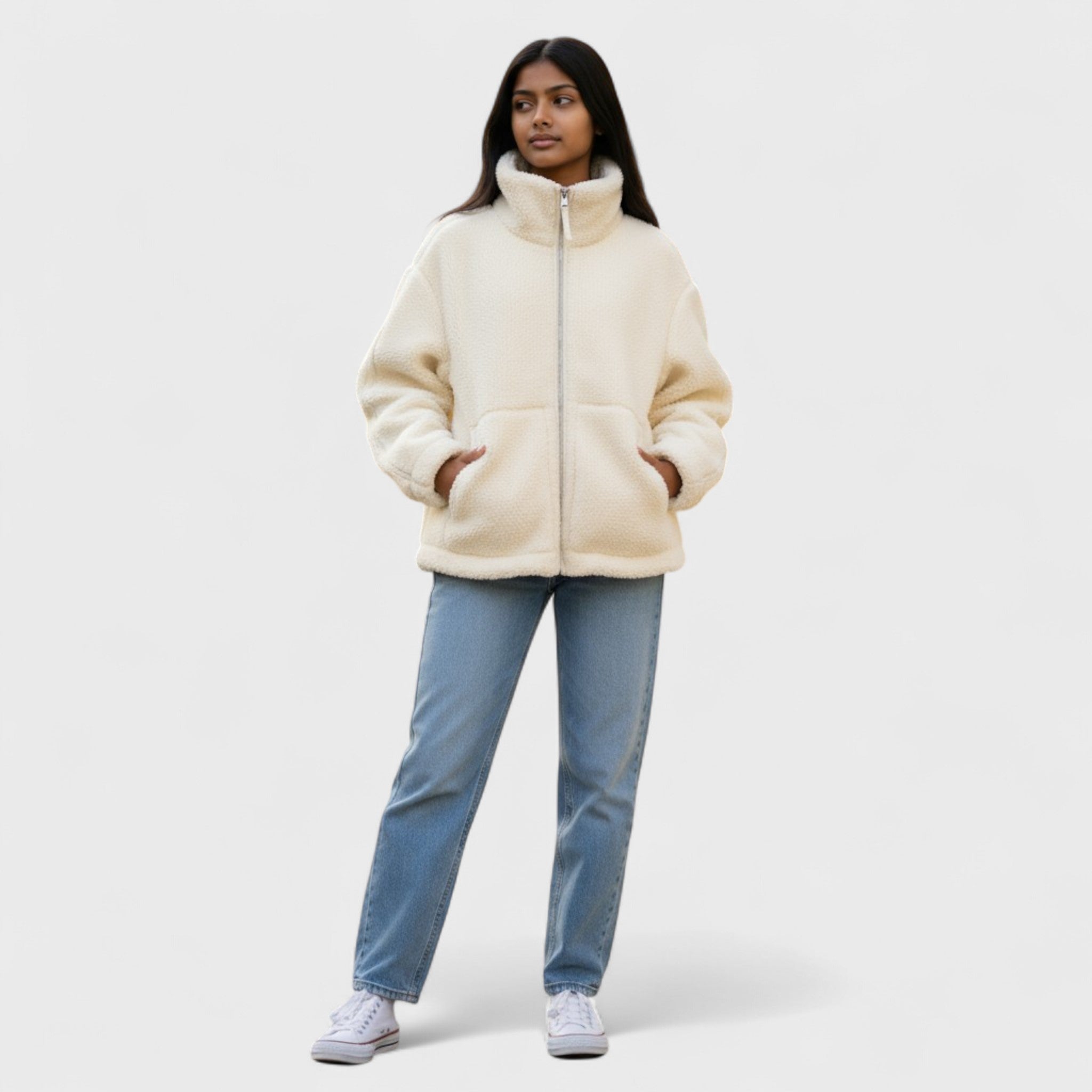 Pluszowa kurtka z wysokim stojącym kołnierzem i pełnym zamkiem błyskawicznym, umożliwiającym szybkie zakładanie i regulację ciepła. Luźny, komfortowy krój z obniżoną linią ramion i szeroką formą pozwala łatwo założyć ją na swetry i bluzy. Duże przednie kieszenie pomieszczą telefon, rękawiczki i drobiazgi, a miękka faktura polaru zapewnia przyjemne wrażenie otulenia każdego dnia.