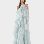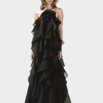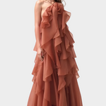 Ta przepiękna długa sukienka w ciepłym brązowym odcieniu emanuje luksusem i romantyzmem. Zaprojektowana z wielopoziomowymi falbanami z lekkiej i transparentnej tkaniny, zachwyca efektownym ruchem przy każdym Twoim kroku.