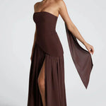 Ta sukienka bez ramiączek emanuje ponadczasową elegancją i kobiecością. To idealny wybór na wieczorne wyjścia i oficjalne okazje.