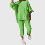 Ten komplet to idealne połączenie swobodnego designu i praktycznego komfortu. Luźna góra i spodnie o prostym kroju zapewniają pełną swobodę ruchów, a nowoczesny wygląd sprawia, że jesteś gotowa zarówno na relaks w domu, jak i nieformalne wyjście do miasta. To doskonałe rozwiązanie dla tych, którzy chcą wyglądać modnie, a jednocześnie czuć się w pełni swobodnie.