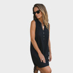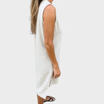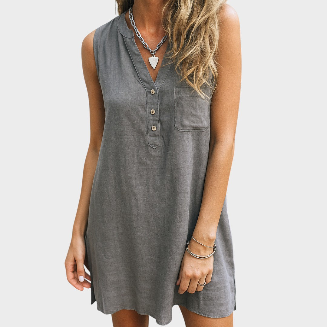 Ta lekka i przewiewna sukienka to idealny wybór na ciepłe dni. Bez rękawów, z nowoczesnym dekoltem w kształcie litery V i ozdobnymi guzikami, oferuje komfort oraz prostą elegancję. Praktyczna kieszeń z przodu stanowi wyjątkowy detal i sprawia, że sukienka jest jeszcze bardziej funkcjonalna. Idealna na spacery, wypoczynek lub nieformalne spotkania z przyjaciółmi.