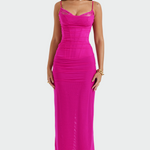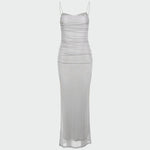 Imponująca maxi sukienka na cienkich ramiączkach z koronkowymi detalami przy dekolcie. Jej dopasowany, sylwetkowy krój podkreśla kształty, a przezroczysty materiał w dolnej części nadaje lekkości i elegancji. Idealna na wieczorne wyjścia i wyjątkowe okazje.