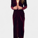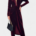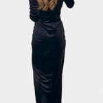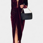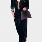 Urocza sylwetka, która łączy w sobie zmysłowość i ponadczasową elegancję. Wilma wyróżnia się głębokim dekoltem w kształcie litery V, który optycznie wydłuża sylwetkę, długimi rękawami nadającymi równowagę projektowi oraz przednim rozcięciem, które dodaje dynamiki i odwagi. Złote wykończenie podkreśla jej magnetyczny charakter, czyniąc ją kreacją stworzoną, by błyszczeć przy każdej okazji.