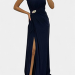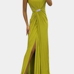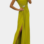Nienaganne połączenie płynności, elegancji i scenicznej prezencji. Emilia wyróżnia się wykonaniem z lekkiej tkaniny, starannie zaprojektowanymi plisowanymi detalami oraz bocznym rozcięciem, które z gracją podąża za każdym ruchem. Odkryty dekolt delikatnie podkreśla linię szyi, a płynny fason subtelnie i szykownie wydłuża sylwetkę.