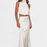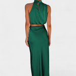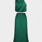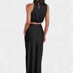 - Drapowany top z wycięciem typu halter dodaje szykownego i rzeźbiarskiego wyglądu