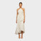 Ta sukienka z wyrazistymi krawędziami emanuje kobiecością i wyrafinowaniem. Asymetryczny fason z eleganckimi falbanami tworzy piękny, falujący efekt, który podkreśla sylwetkę i nadaje sukience wyjątkowego blasku. Idealna na uroczyste okazje, wesela lub wieczorne wyjścia — ta sukienka łączy nowoczesny design z klasyczną elegancją.