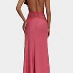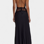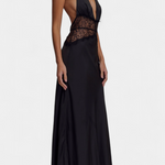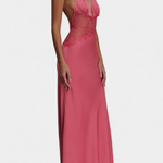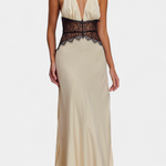 Projekt, który emanuje wyrafinowaną zmysłowością i złożoną elegancją. Martina łączy głęboki dekolt typu halter z delikatną koronkową wstawką w talii, tworząc doskonały kontrast między subtelnością a odwagą. Płynny materiał otula ciało z gracją, a całkowicie odsłonięte plecy nadają całości nieoczekiwany i śmiały charakter.