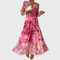 Ta elegancka maxi sukienka emanuje romantyzmem i kobiecością. Długie rękawy, dekolt w kształcie litery V oraz pasek podkreślający talię doskonale akcentują sylwetkę, a zwiewne warstwy nadają lekkości i gracji ruchom. Kwiatowy print wnosi świeżość i wyrafinowanie, czyniąc tę kreację idealnym wyborem na uroczyste okazje, wieczorne wyjścia lub letnie romantyczne chwile.