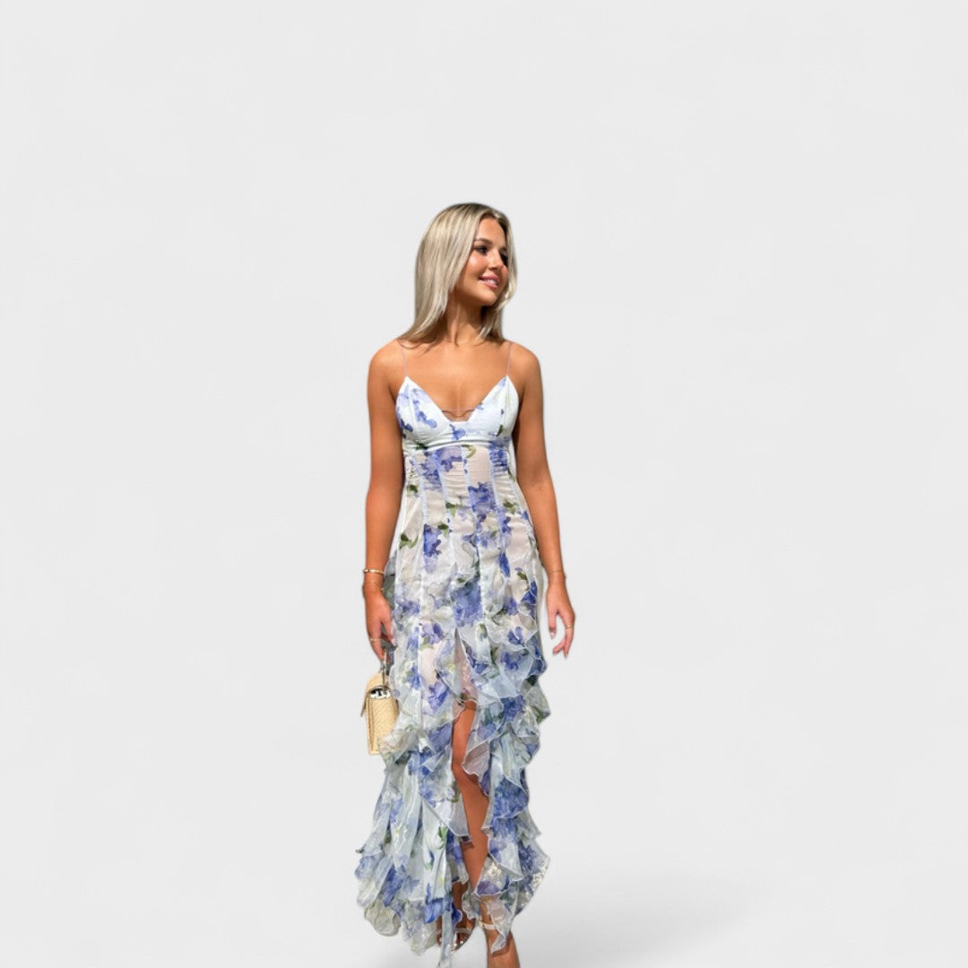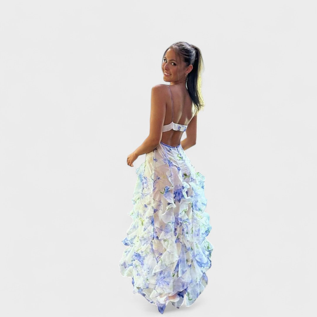 Ta długa kolorowa sukienka z falbanami dodaje nutę wyrafinowania i elegancji w każdej sytuacji. Dzięki kobiecej sylwetce i efektownym detalom oferuje doskonałą równowagę pomiędzy komfortem a blaskiem. Jest idealna na uroczyste okazje, przyjęcia lub wyjątkowe chwile, gdy pragniesz zabłysnąć.