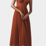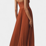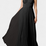 Ustrukturyzowany romantyzm z sylwetką, która płynnie i z gracją przyciąga spojrzenia. Sukienka Nives łączy miękkość plisowanego szyfonu z surowością klasycznego gorsetu, tworząc magiczną równowagę między elegancją a wyrazistością. Jej sercowaty dekolt oraz spódnica o fasonie dzwonu subtelnie otulają sylwetkę, podkreślając jej charakter.
