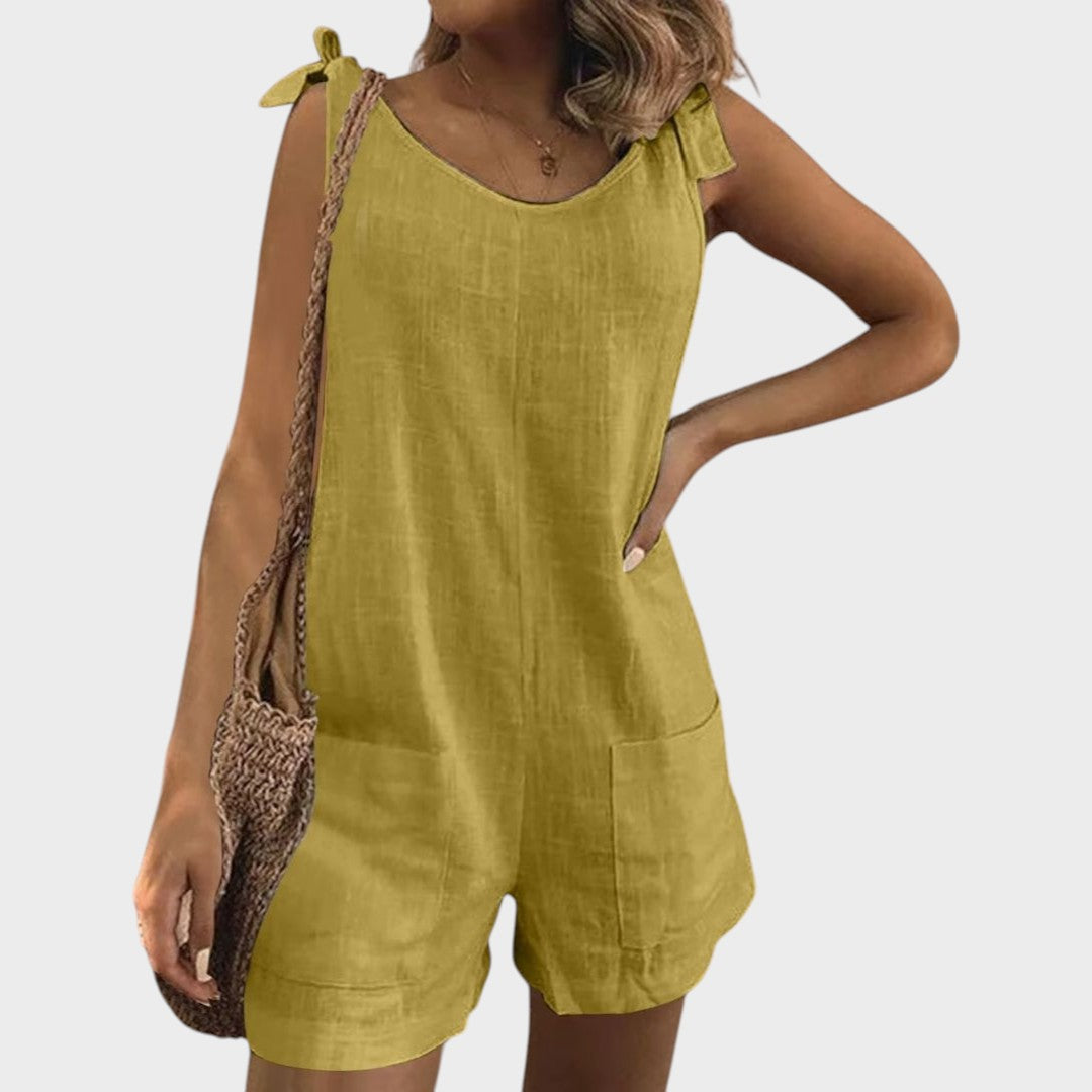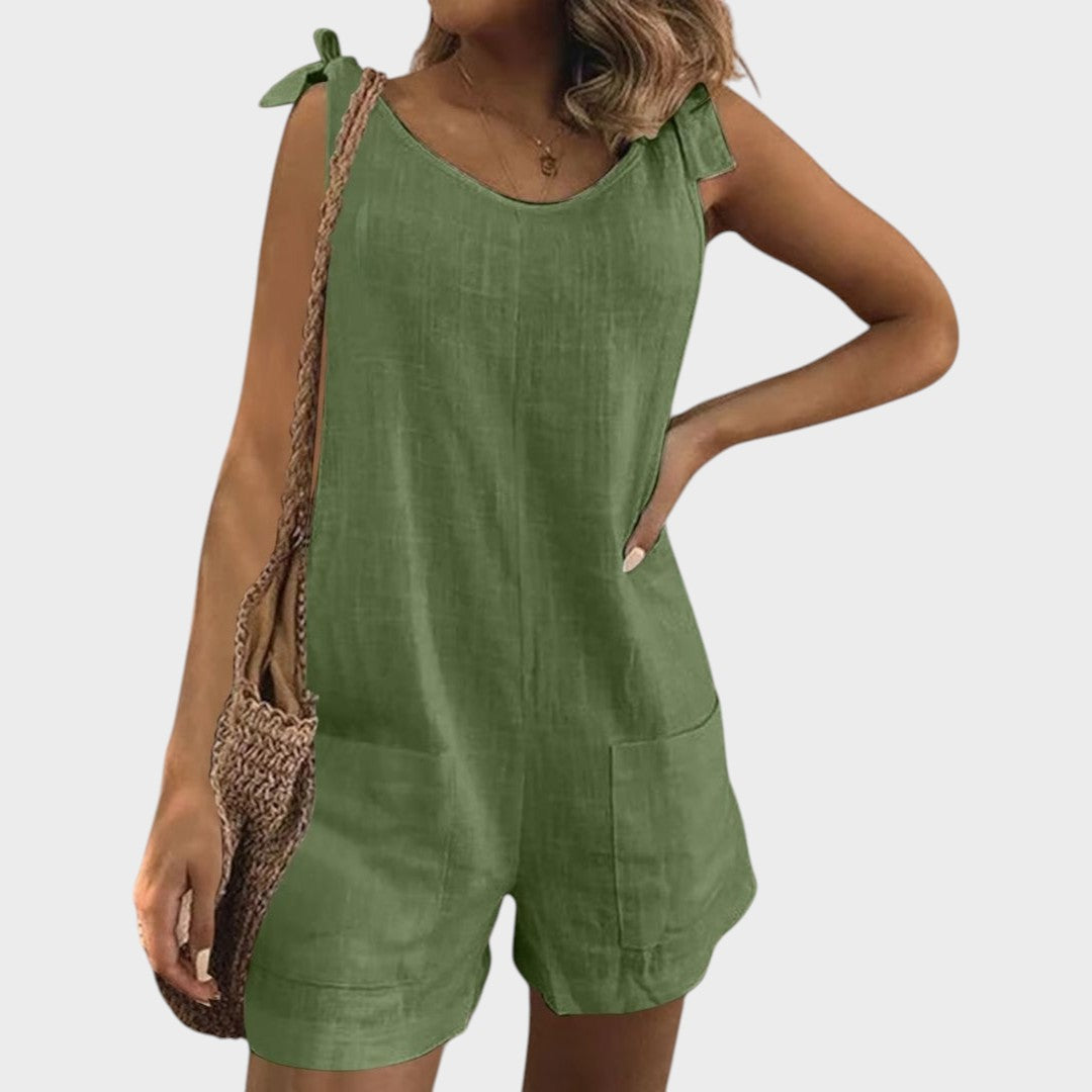 Ten lekki kombinezon to idealny wybór na ciepłe dni i nieformalne okazje. Z nowoczesnym, bezrękawnym krojem, praktycznymi kieszeniami i kobiecymi wiązaniami na ramionach oferuje połączenie wygody i stylu, które będzie Ci towarzyszyć od rana do wieczora.