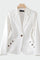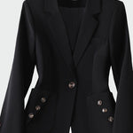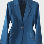 Imponująca marynarka o kobiecej sylwetce, wyróżniająca się eleganckimi detalami. Jeden guzik z przodu nadaje minimalistycznej elegancji, a dekoracyjne guziki przy kieszeniach stanowią nowoczesny akcent. Idealna na spotkania biznesowe, ale także na stylowe wieczorne wyjścia.