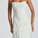 Cienkie ramiączka oraz dekolt podkreślają kobiecy urok, a bogata tkanina o wypukłym wzorze dodaje wyjątkowej tekstury i lekkości ruchu.