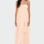 Elegancka sukienka maxi o płynnym ruchu i kobiecej sylwetce, która delikatnie otula ciało. Wyrazisty dekolt i cienkie ramiączka podkreślają szyję i ramiona, podczas gdy wcięcie w talii nadaje elegancką formę. Idealna na wesela, chrzciny oraz wszelkie wyjątkowe okazje.