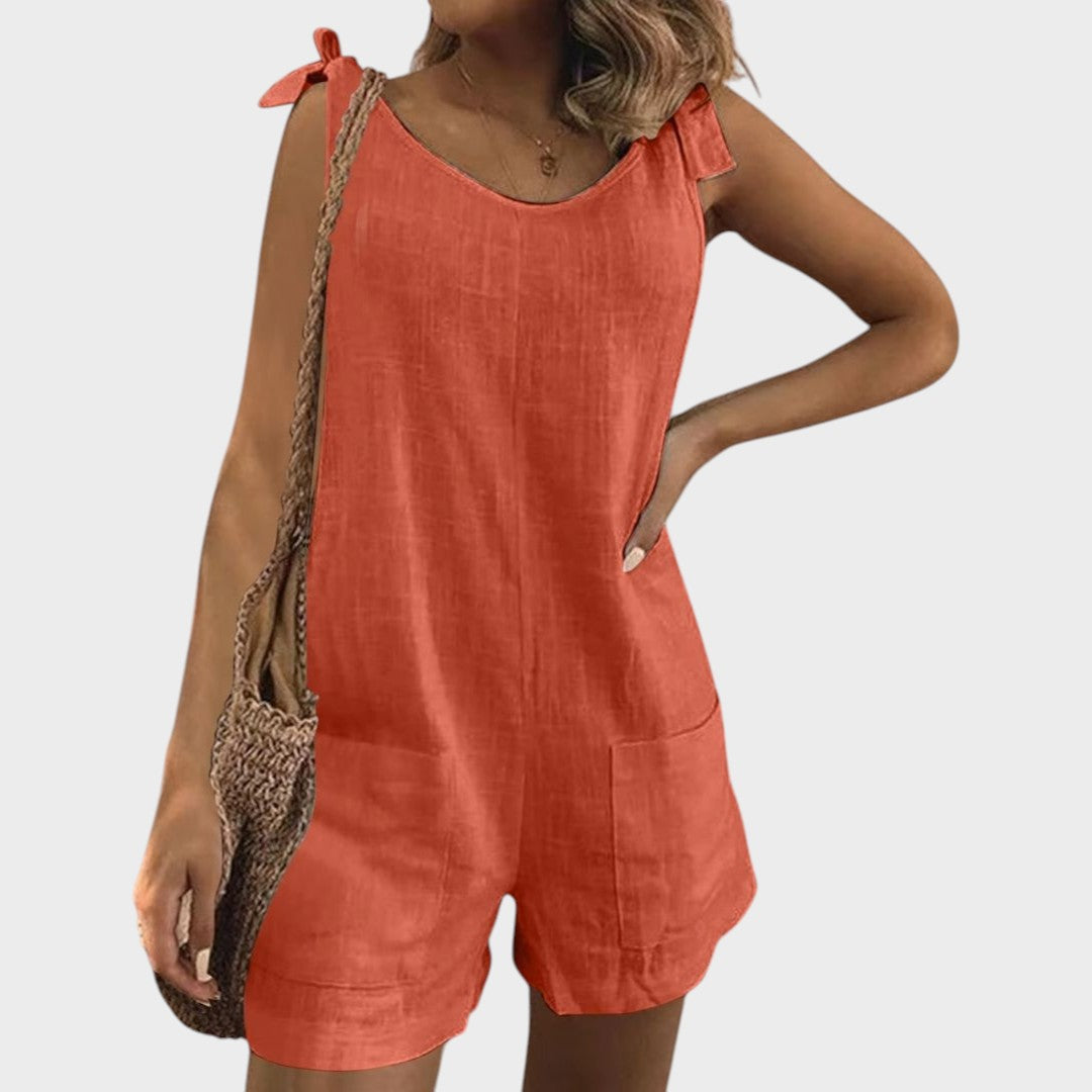 Ten lekki kombinezon to idealny wybór na ciepłe dni i nieformalne okazje. Z nowoczesnym, bezrękawnym krojem, praktycznymi kieszeniami i kobiecymi wiązaniami na ramionach oferuje połączenie wygody i stylu, które będzie Ci towarzyszyć od rana do wieczora.