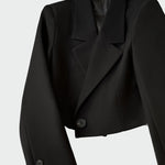 Minimalistyczna krótka marynarka o eleganckim designie i nowoczesnych detalach. Kołnierz o ostrych liniach oraz zapięcie z przodu nadają jej dynamiczny charakter, a krótki fason sprawia, że jest idealna na stylowe wyjścia. Łatwo dopasować ją zarówno do biznesowych, jak i wieczorowych okazji.