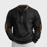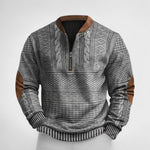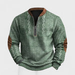 Elegancki sweter z zamkiem do połowy długości i wysoką, miękką stójką, który łączy klasyczny splot typu "kabel" z delikatną fakturą dla premium odczucia. Kontrastowe detale z imitacji zamszu przy kołnierzu, zamku i łokciach dodają wyrafinowanego charakteru, a elastyczne mankiety oraz dół gwarantują idealny fason przez cały dzień.
