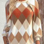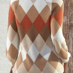 Miękki i elegancki sweter w ciepłych odcieniach beżu i rdzawego koloru.